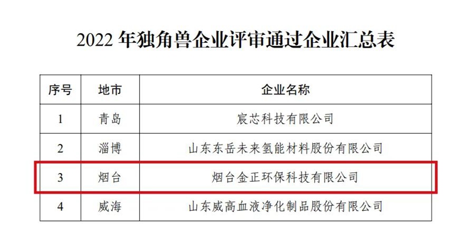 7月19日,山東省工信廳正式公布2022年獨(dú)角獸企業(yè)榜單,煙臺金正環(huán)保強(qiáng)勢上榜,成為本年度僅有的4家獨(dú)角獸企業(yè)之一。
